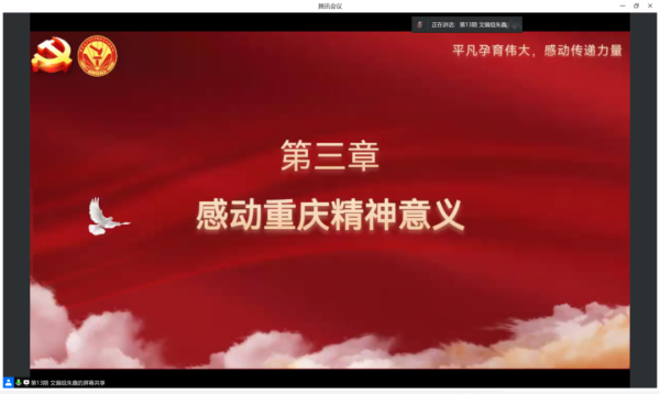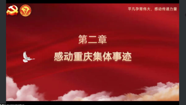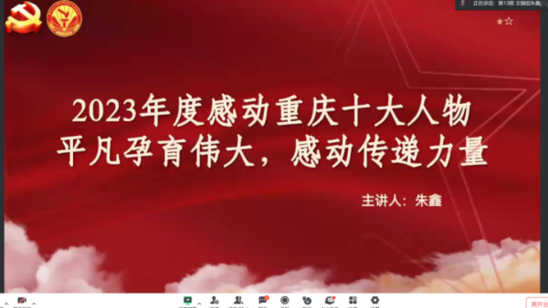 追榜样之光,燃奋斗之焰。随后,朱鑫同学围绕感动重庆精神的意义,详细阐述了当代青年的责任与使命。她谈到,感动重庆先进人物和集体是这座山城“精气神”里的光荣与梦想,是每个人都应该深学细照笃行的榜样。站在新的发展起点,我们更要秉承以实现中华民族伟大复兴为己任的光荣使命,不断践行感动重庆人物精神,将心中的理想与当前的学习结合起来,以永不懈怠的精神状态、永不停滞的前进姿态,让青春在全面建设社会主义现代化国家的火热实践中绽放绚丽之花。