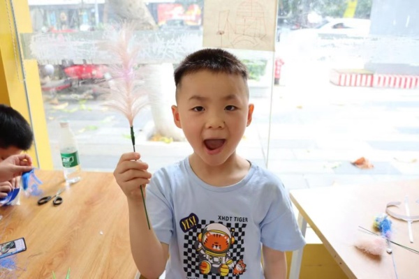 在制作过程中,志愿者与小朋友们分工合作,挑选芦苇杆、编花、染色,每个步骤都井然有序。在他们的共同努力下,平平无奇的芦苇杆被巧妙地编织成各种形状的花朵,并被颜料沾上不同的色彩,为芦苇花增添了独特的魅力。环顾四周,现场气氛融洽,志愿者与小朋友们都沉浸在芦苇花的世界。