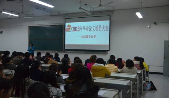 12月6日晚19:30至20:40于主教103、105、111教室,经管学院会计教研室召开2010级会计学本科、2011级会计专科毕业论文动员大会。参会人员包括2010级会计学本科学生406人、2011级会计专科学生110人及二十多位指导老师,大会由会计教研室副主任田翠老师主持。