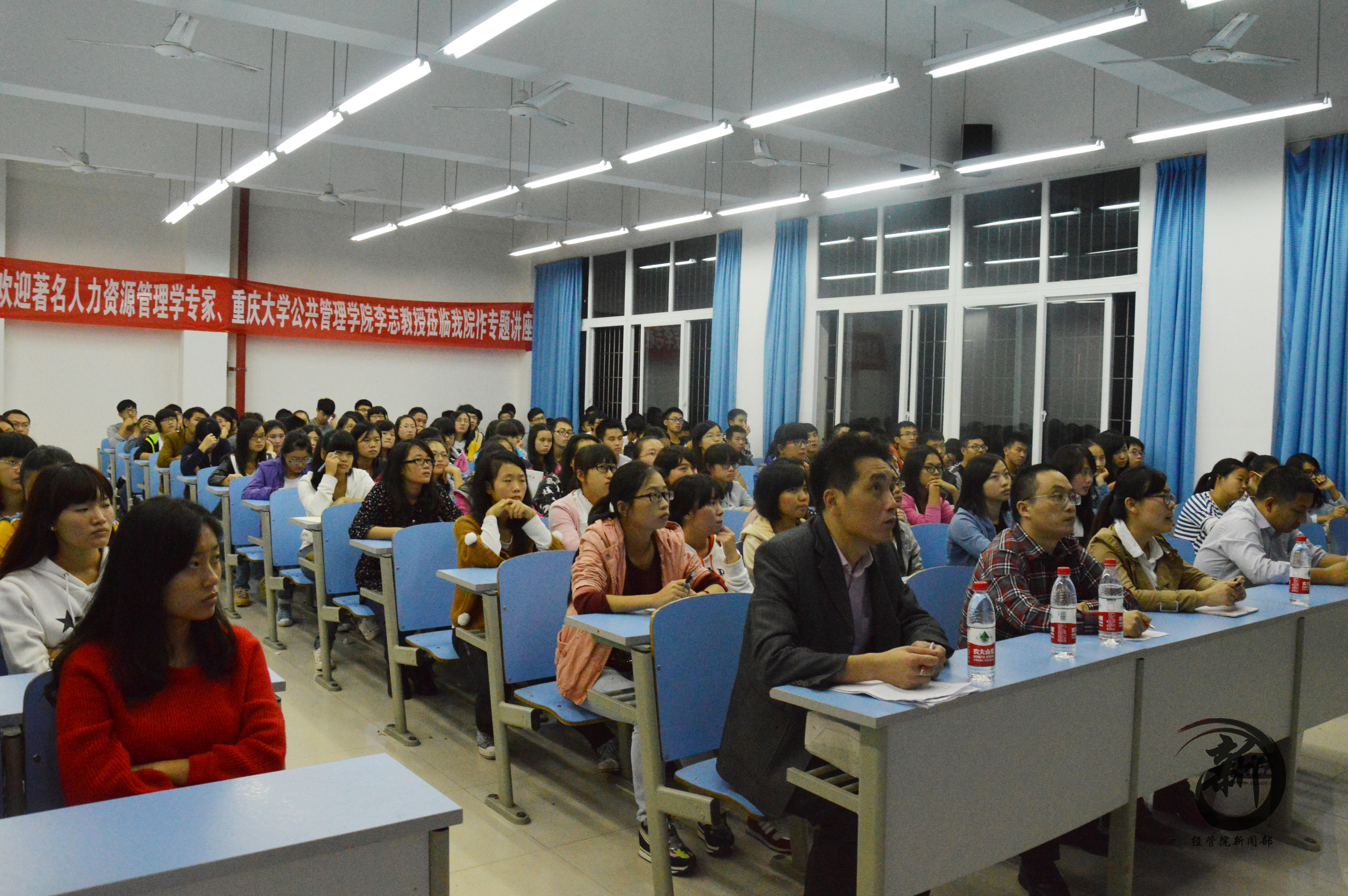 为加强大学生个人职业发展意识、提高企业招聘中大学生的综合竞争力,经济管理学院于2014年10月29日19点在六教111召开了“2014工商管理、人力资源管理的专题讲座”。本次讲座由重庆大学人力资源管理专业博士生导师李志担任主讲,院长曹跃群及工商管理、人力资源管理专业的三位老师出席了本次讲座。