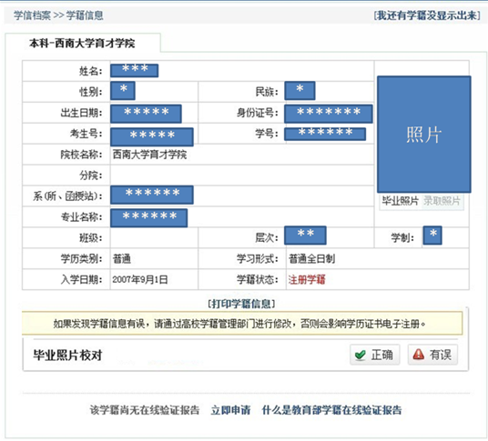 上学期新华社图片社来我院进行毕业生图象信息采集后,现可以在“中国高等教育学生信息网”上查看自己的图象情况,请08本科、09专科的毕业班同学们上网查看、核对自己的图象信息。若不在网上进行照片核对,毕业后将不提供网上查询学历,网址:http://xjxl2.chsi.com.cn/pv/stu/login.do (或者登陆www.chsi.com.cn)