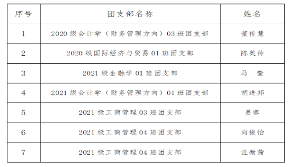 根据《中国共产主义青年团章程》的有关规定,为进一步充实共青团队伍,及时吸收政治思想好、工作表现突出、积极上进的学生加入中国共产主义青年团,增强团组织的战斗力和凝聚力,培养党的后备军。经本人申请、团课培训、各团支部考察,结合基础团务知识以及现场答辩等综合表现,由经济管理学院团总支成立的评选委员会本着公平、公正的态度进行考核,拟定董传慧等7名同学为新发展团员,现将名单公示如下: