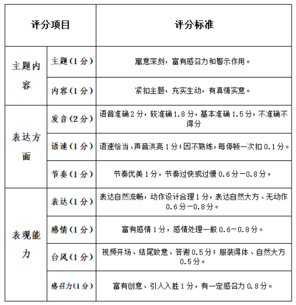 (一)各参赛人员以朗诵稿(word版本)+视频形式提交参赛作品,视频内容包括自我介绍和作品展示,时间控制在2-4分钟以内,可选择性添加合适的背景音乐。视频画质不得低于1080p,30帧,视频比例为16:9(横屏录制),视频无噪音,无明显抖动。