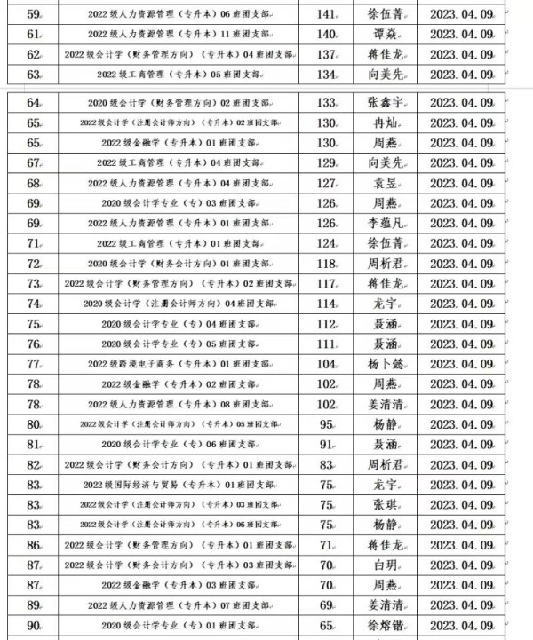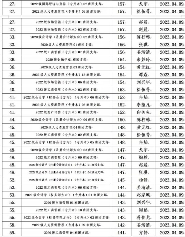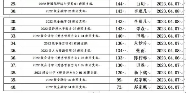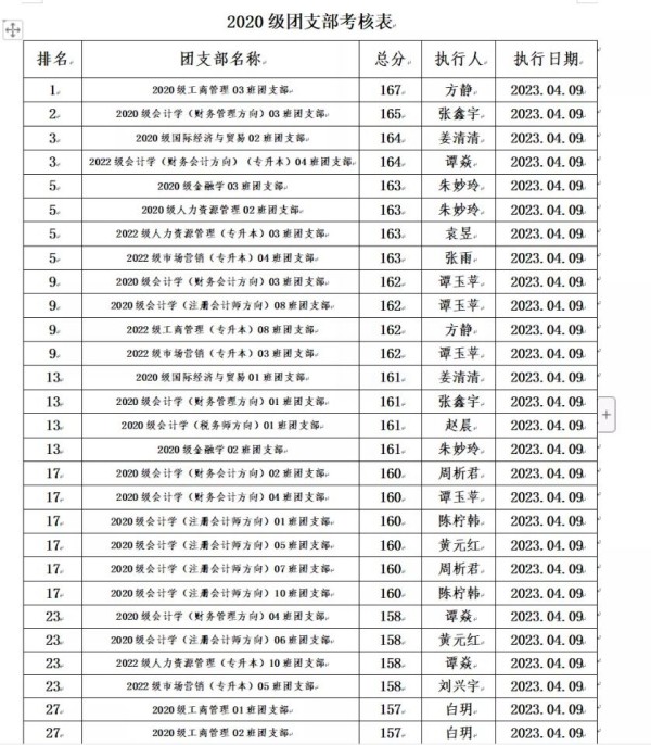 根据《重庆城市科技学院经济管理学院团支部考核细则》的规定,为全面加强经济管理学院团支部的建设,我院团总支于2023年3月对全院各团支部工作进行考核。本着公平、公开、公正的原则,通过对团日活动、青年大学习等方面进行考核,根据综合评分情况,现将考评结果予以公示: