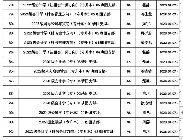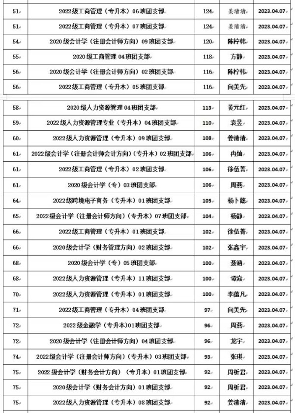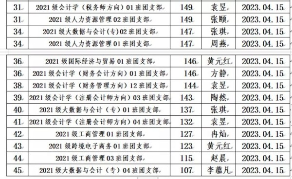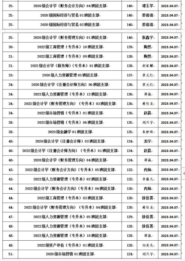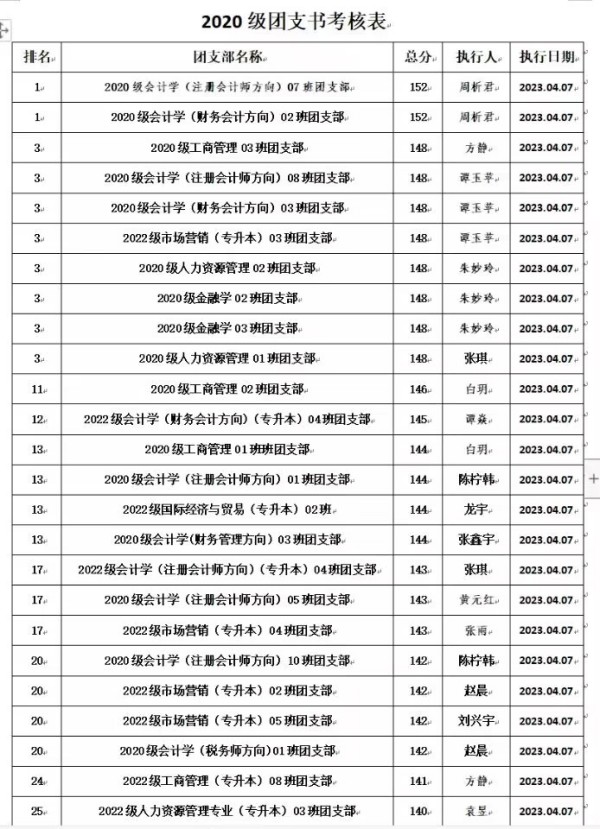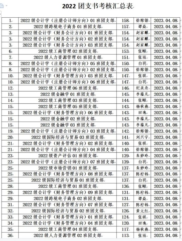 根据《重庆城市科技学院经济管理学院团支书考核细则》的规定,为全面加强经济管理学院团支部的建设,我院团总支于2023年3月对全院各团支书工作进行考核。本着公平、公开、公正的原则,通过对团日活动、青年大学习等方面进行考核,根据综合评分情况,现将考评结果予以公示: