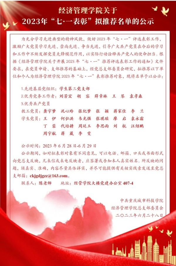 经济管理学院关于2023年”七·一表彰”拟推荐名单公示