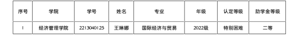 按照国家、学校的政策要求,根据学生实际的受困程度进行增补,增补学籍异动学生名额,因此在辅导员核实具体情况的基础上,向学院评审会提出替补增评部分学生的贫困认定及其助学金等级,学院评审会对这部分学生的材料进行审核,最终选出增补学生1名结果如下: