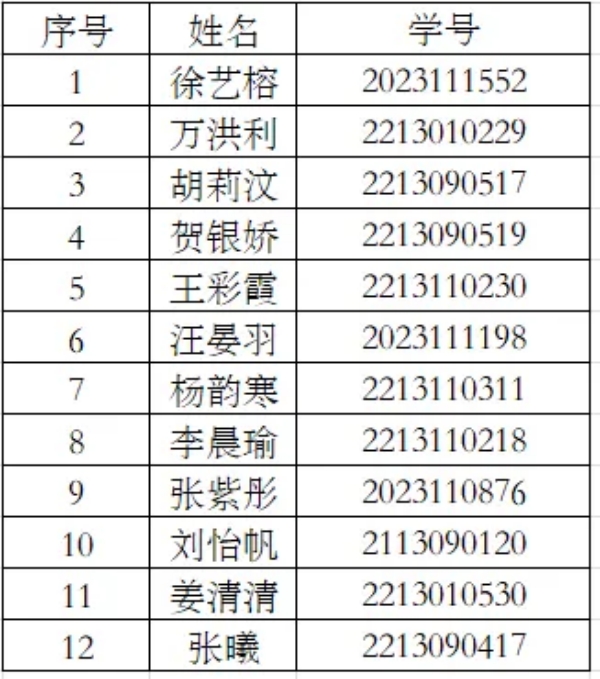 根据《中国共产青年团章程》和《中国共产主义青年团发展团员工作细则》的有关规定,为进一步壮大共青团员的队伍,确保发展团员的规范性和团员质量,充分发挥共青团组织在青年学生成长发展中的重要作用,经本人申请、团课培训、各团支部考察,结合基础团务知识以及现场答辩等综合表现,由经济管理学院团总支成立的评选委员会本着公平、公正的态度进行考核,拟定徐艺榕、万洪利等12名同学为新发展团员,现将名单公示如下: