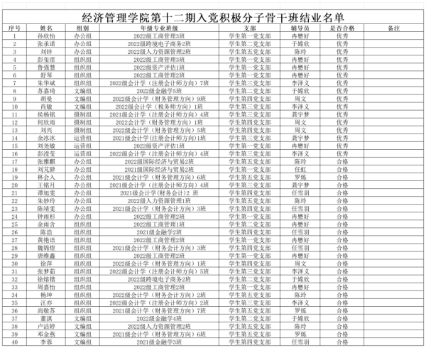 为提升入党积极分子责任担当意识,强化入党积极分子教育管理,端正入党动机,提高党员发展质量,切实保障我院党建工作持续高效发展。根据《经济管理学院学生党员骨干班暨入党积极分子骨干班管理办法》相关规定,经济管理学院第十二期入党积极分子骨干班成员通过为期一年的学习,于5月10日完成集中培训。经过理论学习和实践活动的综合考察,张雅麒、刘芃驿等48名学员考察成绩合格,予以结业;孙欣怡、张承诺等16名学员表现优异,被评为“优秀学员”;杨万顺、陈秋月等16名学员成绩不合格,不予结业。