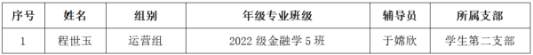 为全面贯彻党的教育方针,落实立德树人的根本任务,切实做好入党积极分子的培养和教育工作,强化我院入党积极分子队伍建设,进一步推动我院党建工作的发展行稳致远。根据《中国共产党普通高等学校基层组织工作条例》和《经济管理学院学生党员骨干班暨入党积极分子骨干班管理方法》之相关规定,结合我院实际,经本人申请、资格审查、公开竞选、支部推荐、综合考察等选拔程序,经管党总支研究决定,拟定程世玉一名同学为第十三期入党积极分子骨干班增补成员,现将名单公布如下: