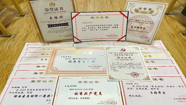 入校以来,王依琪同志在学习上她从不懈怠,并以孜孜不倦的求学态度斩获优异成绩,曾连续两年综合测评专业第一,获重庆市“优秀学生干部”,学校“综合测评一等奖学金”、“优秀毕业生”、“三好学生”,学院“博学雅实先进个人”等荣誉称号。在校期间她对自己要求严格,不断丰富、开阔自己的知识和视野。在生活中,王依琪同志采用日程表的方式来记录协调好学习、工作与生活,有效利用好时间,合理规划并附注行动。善于记录使得她时常发现生活中的美好,她经常利用空闲时间更新自己的公众号,这样的生活方式使得她很快找准人生方向、减少迷茫,对待生活也变得更加积极与勤奋。