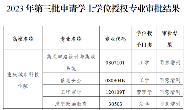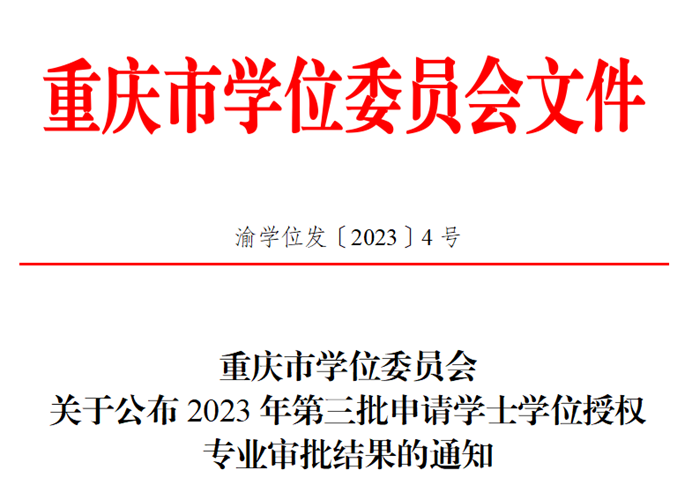 近日,重庆市学位委员会发布了《重庆市学位委员会关于公布2023年第三批申请学士学位授权专业审批结果的通知》(渝学位办函﹝2023﹞4号,我校今年的新专业电气工程与智能制造学院的“集成电路设计与集成系统”、人工智能与大数据学院的“信息安全”、建筑管理学院的“工程审计”、马克思主义学院的“思想政治教育”四个专业顺利通过新增学士学位授权专业增列审核,获得学士学位授予权。目前,学校获得学士学位授予权专业共44个,涵盖工、理、经、管、文、法、艺、教等八大学科门类,我校“以工学为主、多学科协调发展”的办学格局得到进一步优化。