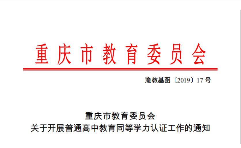 根据《重庆市人民政府关于印发重庆市深化普通高等学校招生综合改革实施方案的通知》(渝府发〔2019〕11号)、《重庆市教育委员会关于印发普通高中学业水平考试实施方案的通知》(渝教基发〔2018〕24号)等文件精神,现就开展普通高中教育同等学力认证工作有关事宜通知如下: