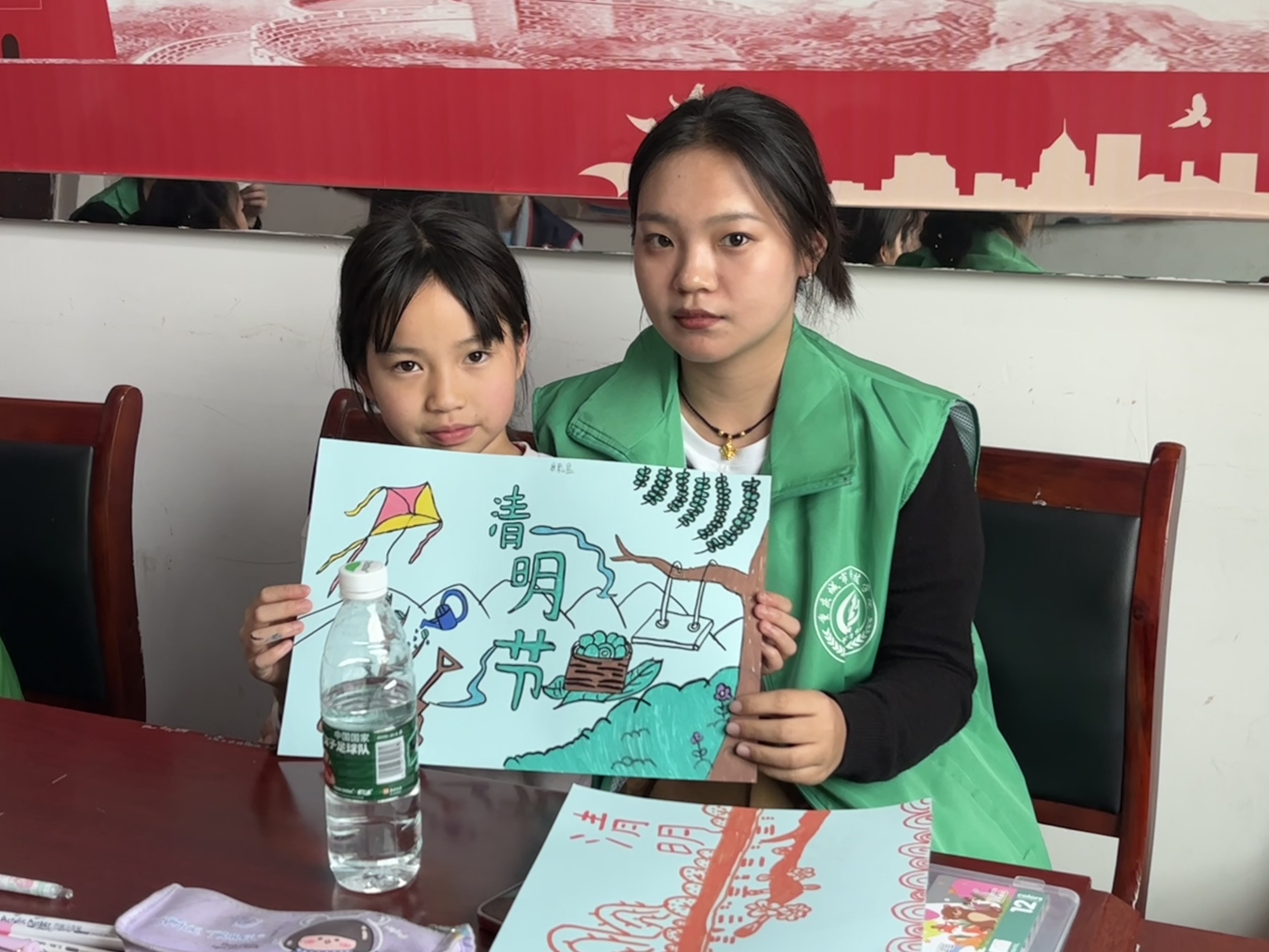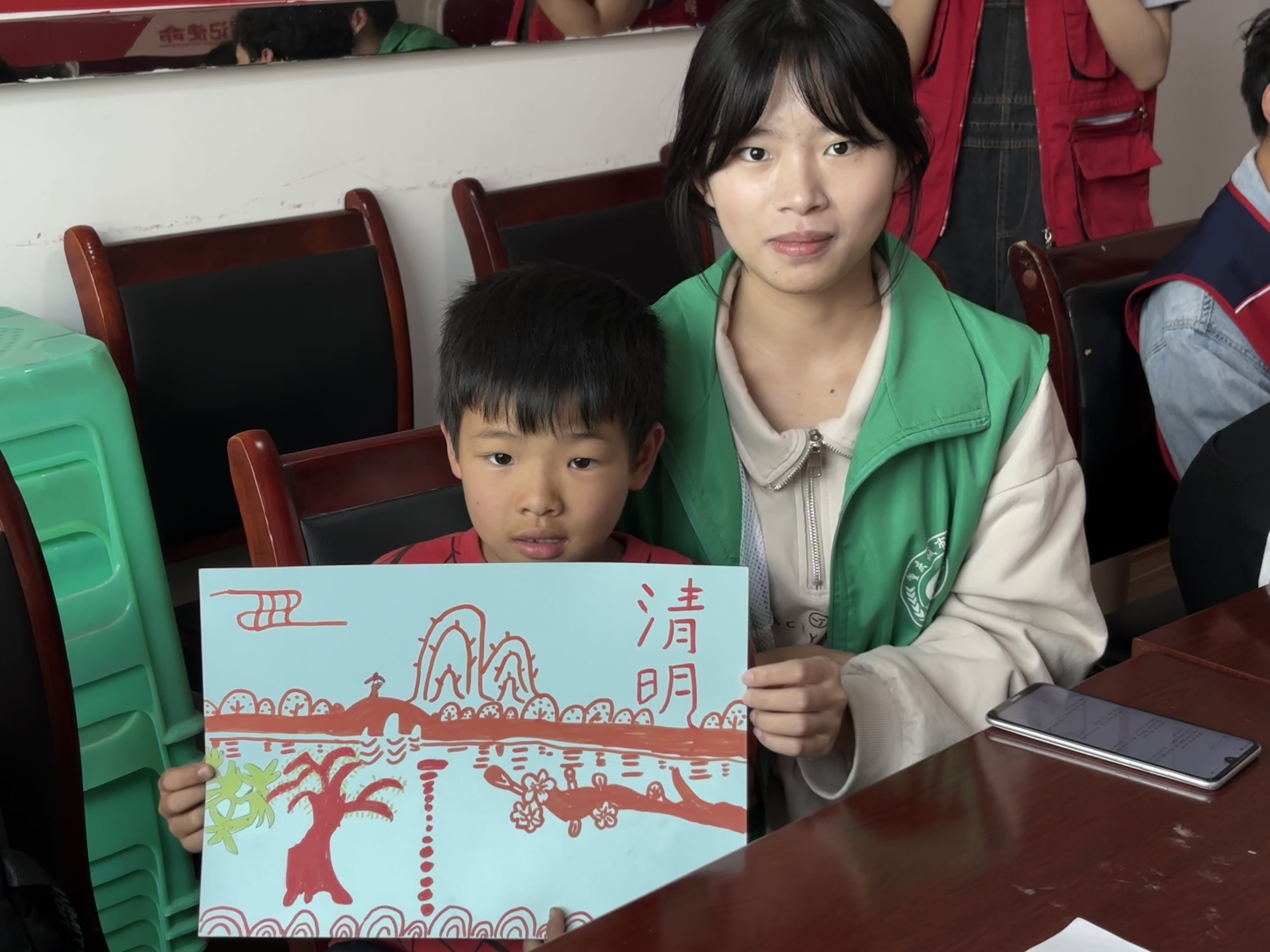 下午,志愿者们准时前往永钢村便民服务中心,接着开始辅导小朋友们上午未完成的作业,在完成作业之后,便开始协助小朋友们一起绘画有关清明节的特色绘画,一张张白纸逐渐变得丰富起来、一幅幅生动有趣的画在小朋友们笔下浮现,作完画后小朋友们拿起自己的作品在镜头前留下灿烂的笑容。
