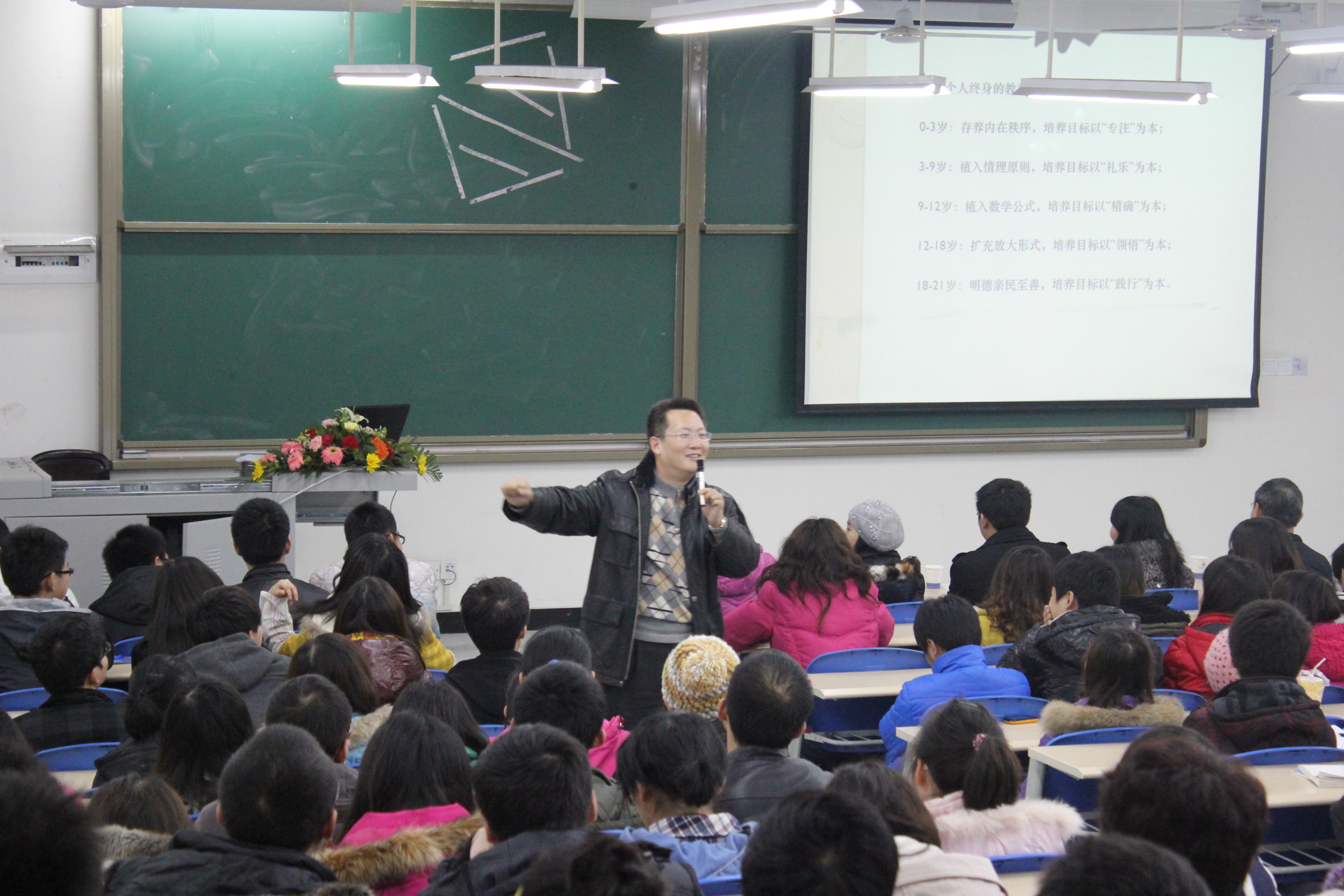晚上7点整,赵彬博士开始了讲座。讲座题目是当代教育体制下的大学生人生规划。他从高校教育谈到高校人才培养,再讲到大学生人生规划,最后他用蒲松龄的名句:“有志者,事竟成,破釜沉舟,百二秦关终属楚;苦心人,天不负,卧薪尝胆,三千越甲可吞吴”来与同学们共勉。原定90分钟的讲座持续了两个半小时,整场讲座气势磅礴,精彩无比,同学们被赵博士生动贴切的讲解内容和幽默诙谐的话语深深吸引,使他们对自己的大学规划有了新的认识,可谓受益匪浅。