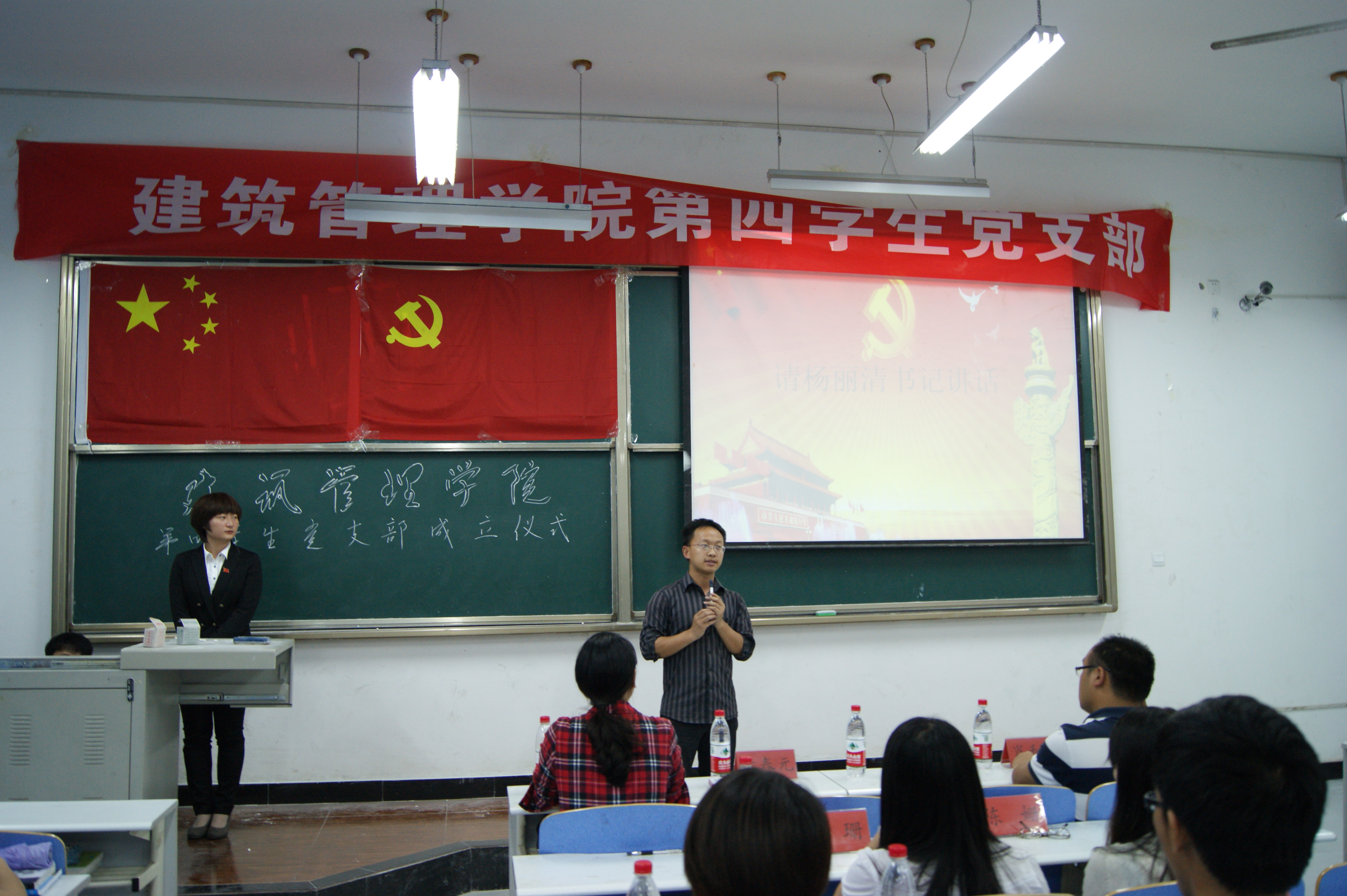 5月22日晚,建筑管理学院第四学生党支部成立仪式在主教101举行。建筑管理学院第二学生党支部书记吉春元老师,建筑管理学院第三学生党支部书记肖和平老师,建筑管理学院团总支书记谭莉老师及其他辅导员老师与第四党支部全体入党积极分子参加了成立仪式。
