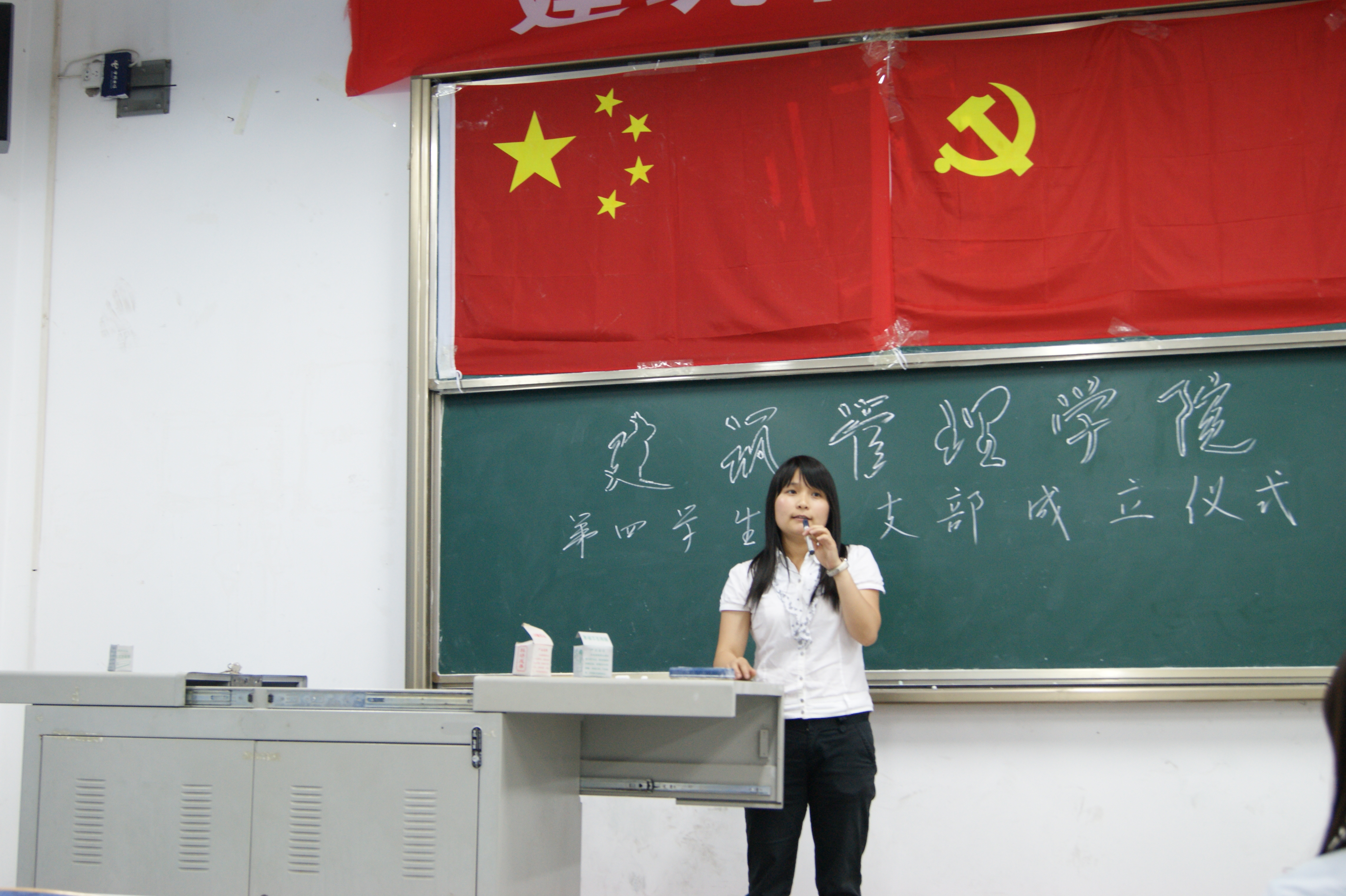 仪式正式开始,全体师生奏唱国歌后,吉春元老师向大家致辞。他说:“建筑管理学院第四学生党支部在今天正式成立,任命牟珊老师为建筑管理学院第四学生党支部书记。这是一支全新的队伍,支部的建设需要每个积极分子和党员以及老师的共同努力,大家一起团结一心,把第四学生党支部创办得更加优秀,第四学生党支部将会有一个更好的未来。