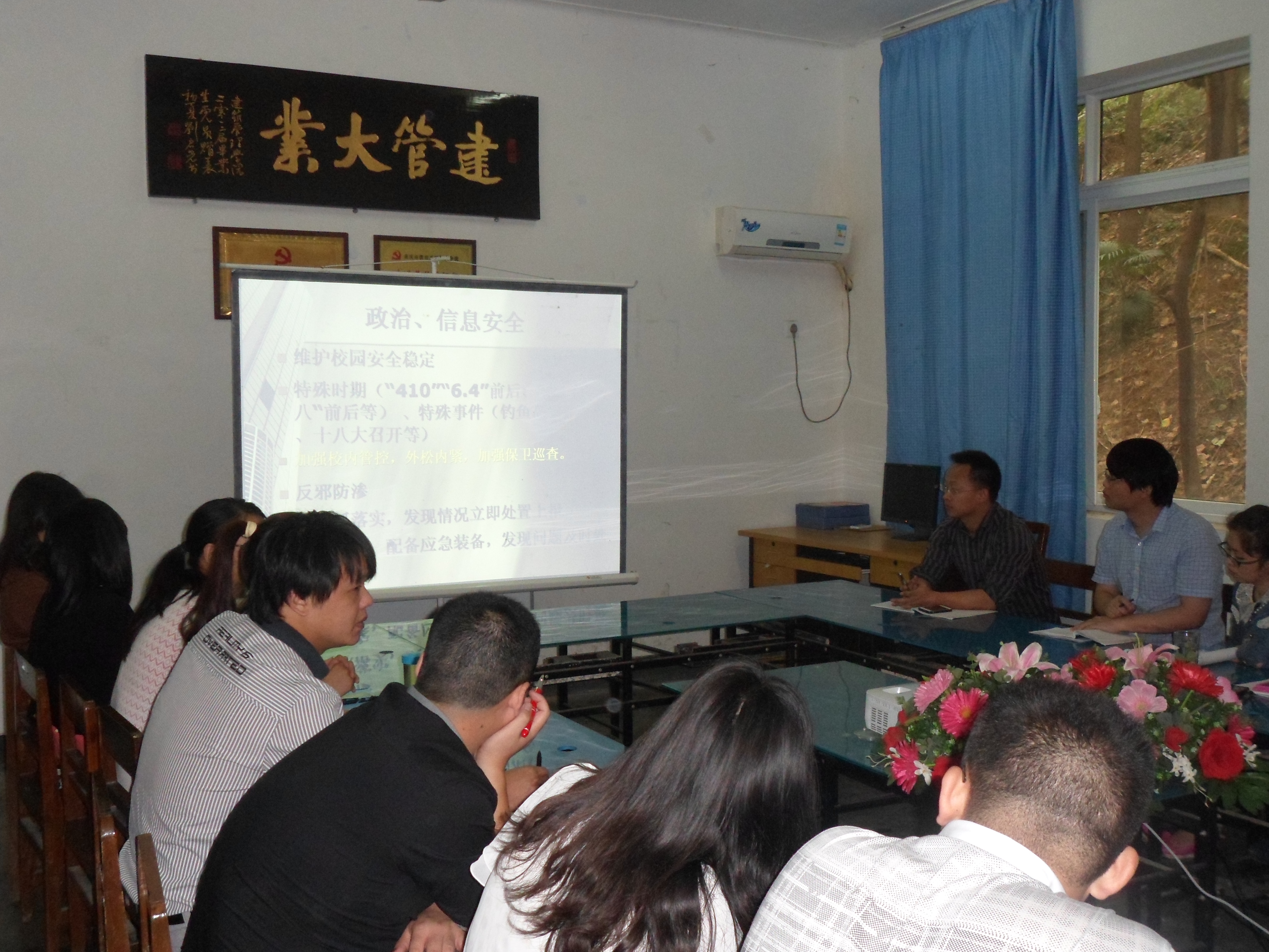 5月30日上午10时,建管学院请到校保卫处胡兵副处长,对学院的21名辅导员进行了安全知识培训,建管学院党总支书记诸海磊,副书记杨丽清出席了讲座。 胡处长用了许多身边实实在在的例子,以小见大,深入浅出地从政治、信息、消防、治安、交通、食品六个方面对安全常识、安全隐患、安全疏导、安全事件的处理等方面对辅导员进行了一一讲解。他强调,安全事……