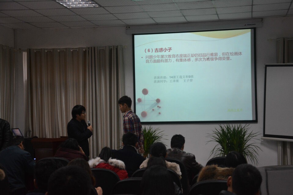 赛中,同学们声情并茂的表演一个又一个典型事件。从“偷盗风波”到“酒后滋事”赛场气氛十分活跃,辅导员们的表现也可圈可点。师生们共同解决了各式各样的案例,把校园生活中的突发事件概括且全面的展示了出来。