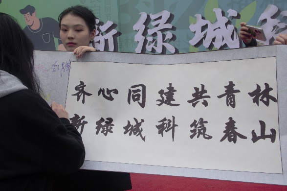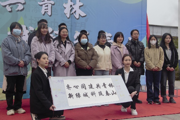 活动结束后,参与植树活动的志愿者们集体在横幅签名并合影留恋。