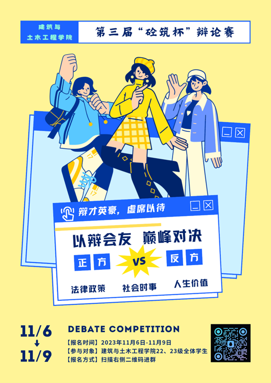 为给广大建筑土木学子提供一个学术交流和思想碰撞的平台,提高其思辩能力和表达技巧。建筑与土木工程学院第三届“砼筑杯”辩论赛报名开始啦!本次“砼筑杯”辩论赛,将于11月13日正式举行。