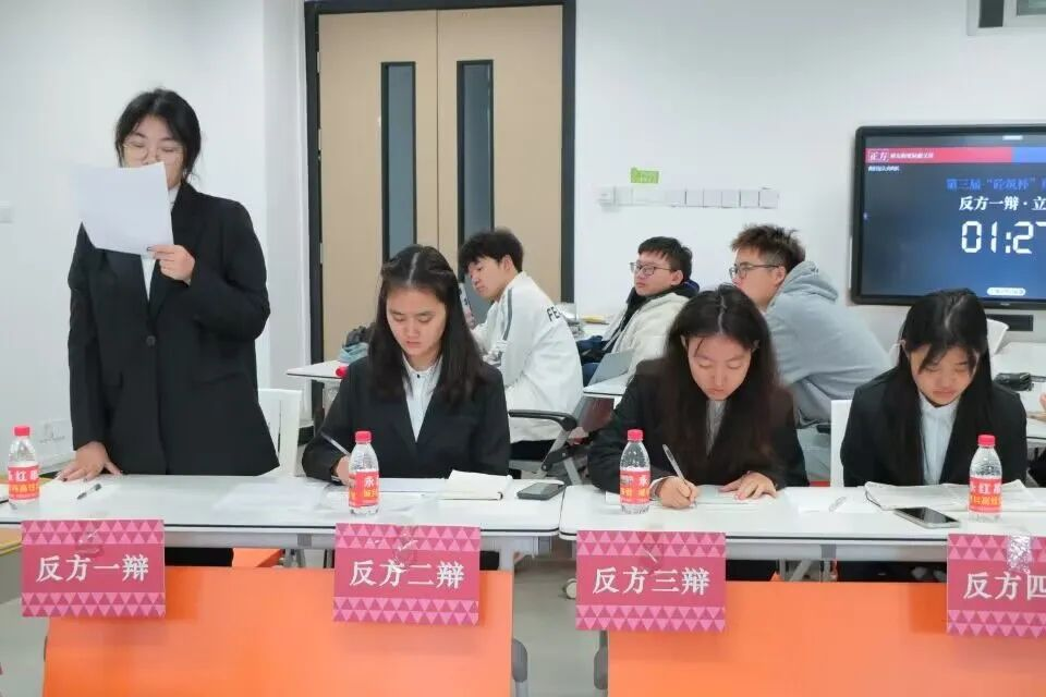在主持人冉絮的介绍下,正反双方互相问礼,而后就各自论点展开激烈辩论。比赛过程紧张而有序,正方立论鲜明,论据充分,势如破竹;反方则从多个角度进行反驳,舌战群儒,毫不示弱。双方选手思维敏捷、言辞犀利、文思敏捷,在自由辩论环节更是将比赛气氛推向高潮,观众们热情高涨,响起了一阵又一阵掌声。