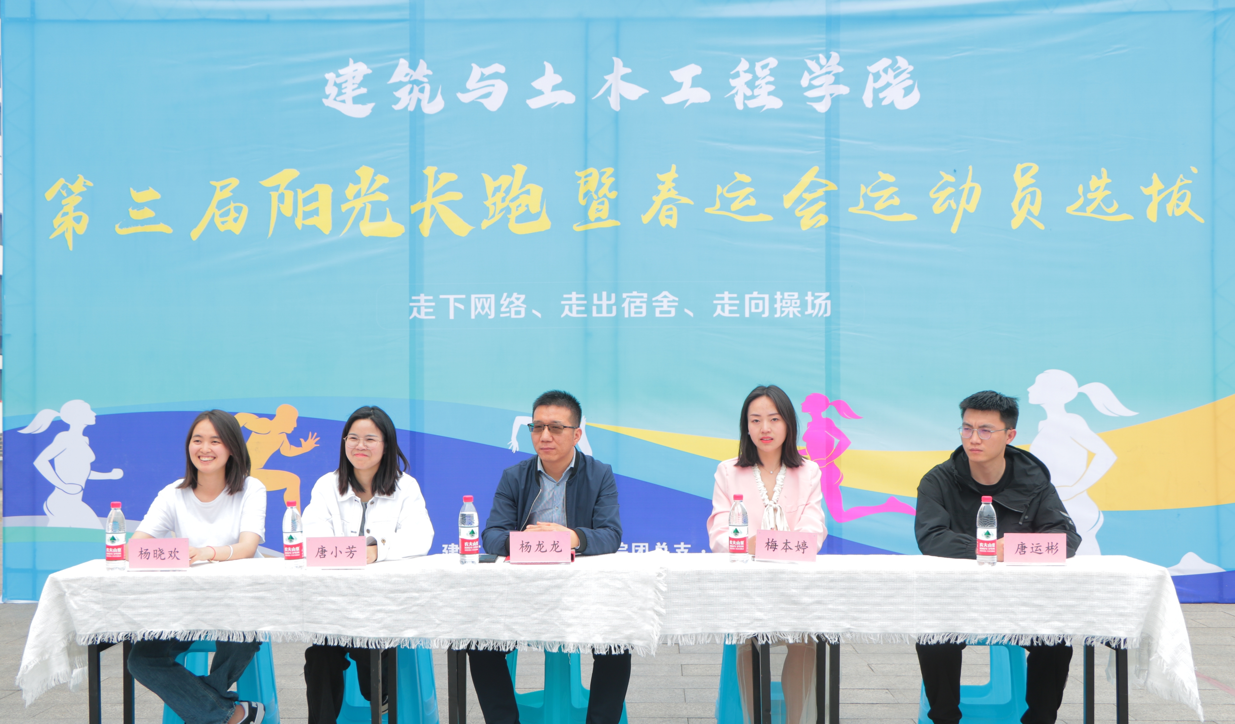 春意盎然,阳光明媚,为了展示学子们的青春风采和精神面貌,建筑与土木工程学院于3月29日举办了阳光长跑暨春运会运动员选拔动员大会。出席本次活动的领导有建筑与土木工程学院院长助理杨龙龙,团学指导老师唐小芳、梅本婷、杨晓欢、唐运彬。