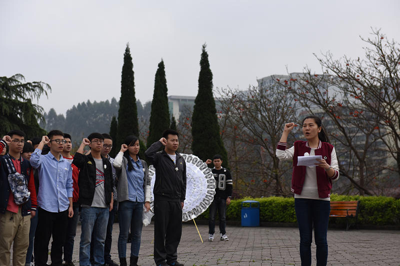早上9点30分,我院党员,积极分子带着花圈、鲜花乘坐车抵达桂山公园,徒步了走进了烈士墓碑。在张静帆老师的组织下,学生党员代表全体党员,团员向革命先烈敬献上素有崇敬之意的花圈,志愿者们也一一走向前去向烈士们献上鲜花。大家在烈士墓碑下低头三鞠躬并默哀,寄托对烈士们的哀思。随后,学生党员代表在烈士纪念碑前宣读了“缅怀革命先烈,弘扬爱国精神”的悼念词,全体志愿者低头表达心中那份对革命先烈们的沉重情感,以示对先烈们的缅怀和敬意。