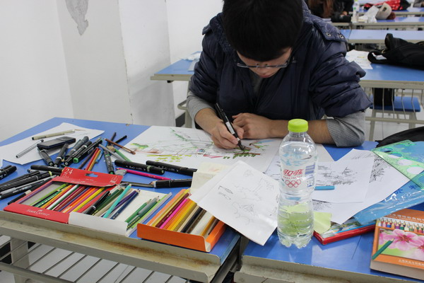 近日阴沉的天气并未影响到同学们参加比赛的积极性,下午一点二十左右,已陆续有参赛者带着画具来到了比赛现场填表签到,然后进行了工具的调试等充足的赛前准备。比赛期间,所有的参赛选手都投入了百分之百的热情,严肃而认真地在画纸上勾勒出一道道或轻或重线条。一时间,偌大的赛场内只能听见笔尖划过画纸的声音。赛场内还贴心的准备了矿泉水,纸胶带和备用画板等物品,以备不时之需。四点半左右,便有很多人完成了他们的作品,陆续离开了考场,直至五点整比赛正式结束,所有的参赛者均停笔离场。