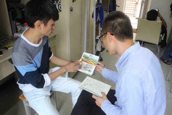 由于4名创作人时间关系,记者只对曾绍强同学进行了专访。根据曾绍强同学的阐述,我们了解到他们四个人最初是看到了重庆邮电大学的明信片觉得很不错,自己学校也可以做出这样一套有意义的产品于是便与手绘培训班的老师合作,从最初的底稿到最后印刷成册包装一共花费了近四个月的时间,途中也曾想过放弃但最终还是凭借自己的坚持和伙伴的鼓励完成了这套精美的明信片。