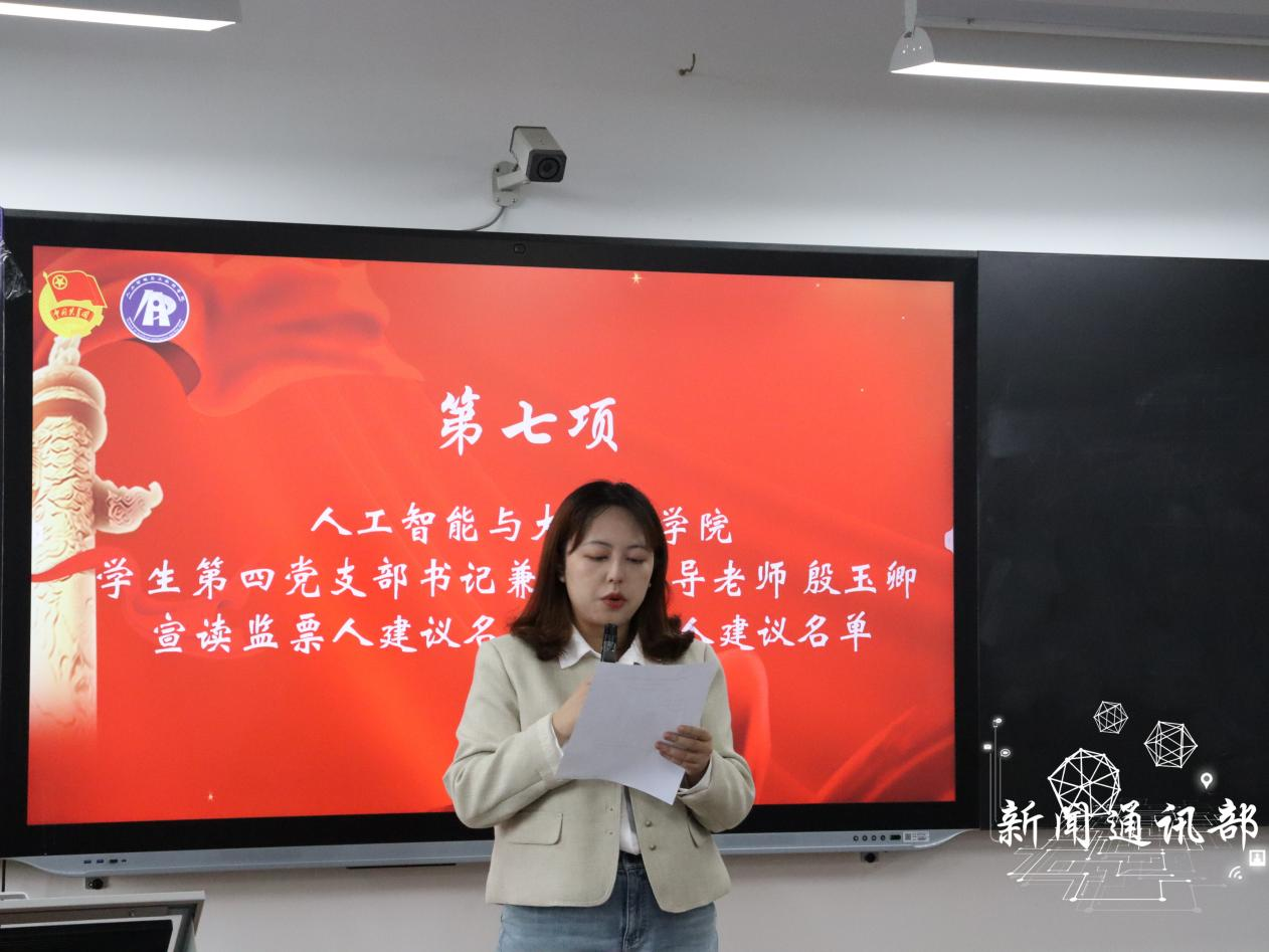 (学生第四党支部书记兼团学指导老师殷玉卿宣读监票人和计票人名单)