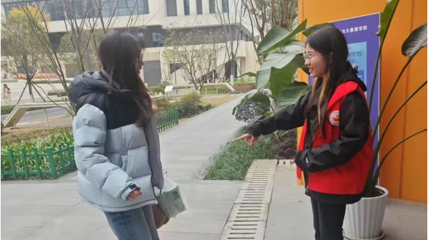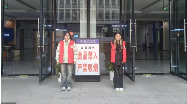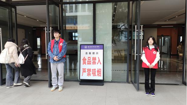 在此次学风建设活动中,学生志愿者们于课前半小时在厚德楼和博学楼一楼站岗,对同学们进行“三带四不”温馨提醒与劝导。这一举措,帮助同学们养成了良好的学习习惯,提高自身素质,共同助力营造学院优良学风。