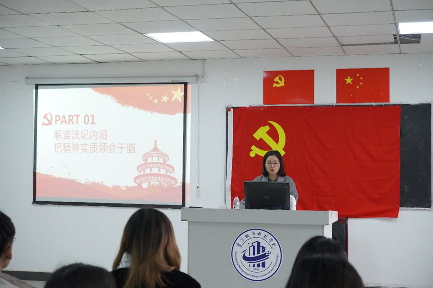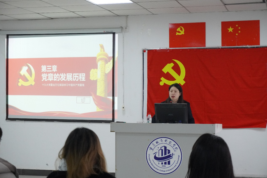 会议伊始,建筑管理学院党总支组织委员魏丹从新时代中国特色社会主义思想、党章的概述、党章的发展历程、党章的总纲、党章的条文和学习十九大党章六个方面出发,详细解读《中国共产党章领》的重要涵义,并强调要深刻理解马克思列宁主义、毛泽东思想、邓小平理论、“三个代表”重要思想、习近平新时代中国特色社会主义思想确立为党的指导思想的重大意义,深入领会科学发展观的精神实质,增强贯彻落实科学发展观的自觉性和坚定性,坚定不移走中国特色社会主义道路。