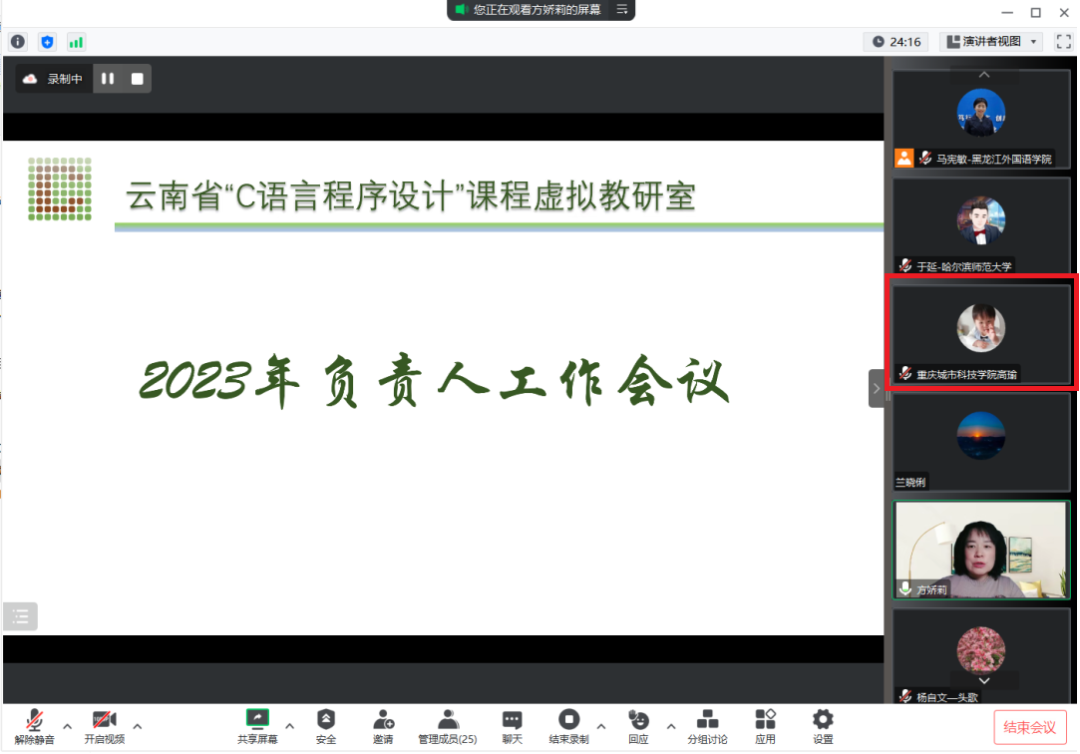 近日,“C语言程序设计”课程虚拟教研室2023年首次各高校负责人工作会议通过腾讯会议举行,重庆城市科技学院人工智能与大数据学院院长助理高瑜副教授、计算机系主任颜烨副教授应邀参会。教研会由云南省兴滇英才教学名师、国家精品在线开放课程负责人、首批国家线上一流课程负责人、首批国家线上线下混合式一流课程负责人、昆明理工大学方娇莉教授主持。哈尔滨师范大学、山西大同大学、新疆大学、北京信息科技大学、德宏职业学院、云南中医药大学等20余所高校的C语言课程负责人、企业专家30余人在教研会上进行了交流,探讨了如何开展“C语言程序设计”课程建设、教研及提高学生编程能力的竞赛事宜。