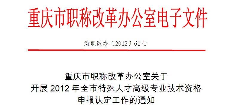 附件一:重庆市职称改革办公室关于开展2012年全市特殊人才高级专业技术资格申报认定工作的通知