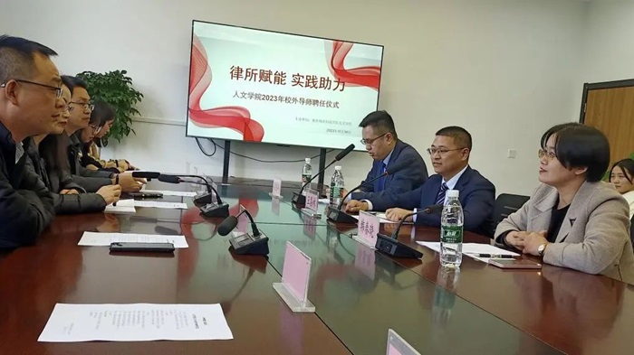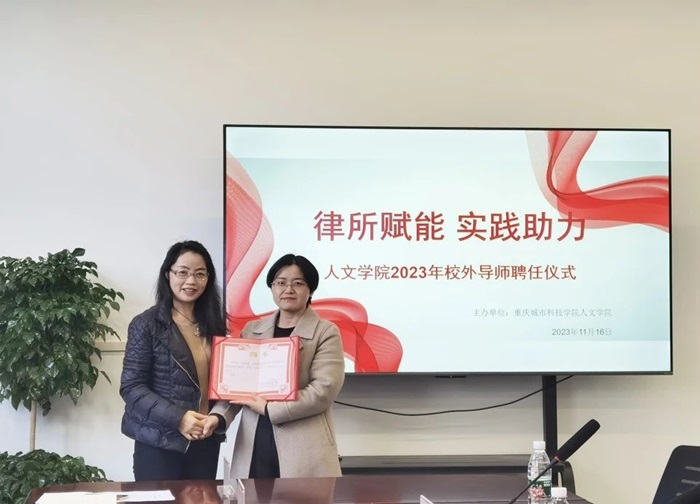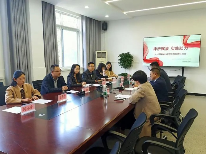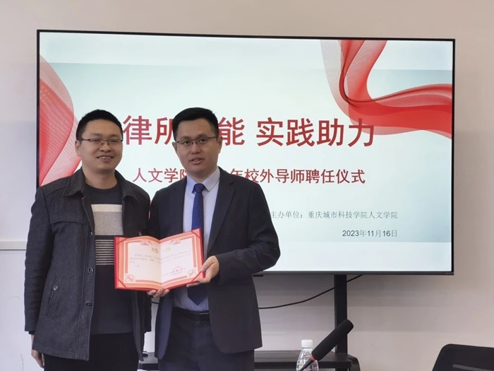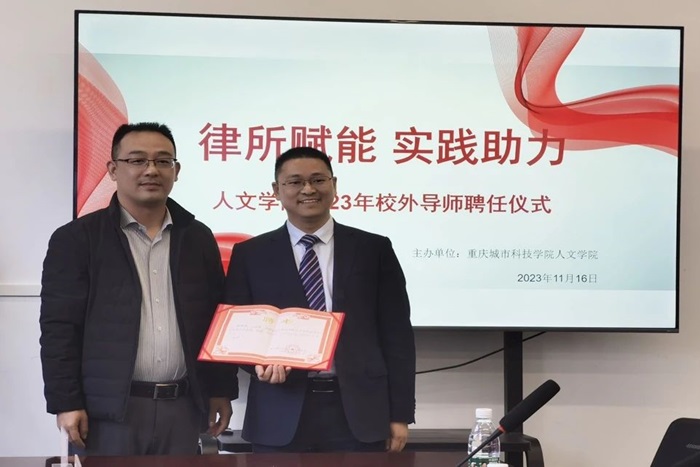 2023年11月16日14:00,重庆城市科技学院人文学院2023年校外导师聘任仪式在重庆城市科技学院人文学院223会议室顺利举行。学院院长邓仕伦、学院党总支副书记纪振鹏、学院副院长黄伟、广东卓建(重庆)律师事务所高级合伙人王昌林、重庆鲁本律师事务所副主任韩春晓、重庆鲁本律师事务所高级合伙人肖忠华出席了本次活动。参加本次活动的还有人文学院法学系主任严平艳、副主任王丹丹、人文学院实验中心副主任周丹、法学系教师何冰原以及参加校外导师项目的全体本科生。