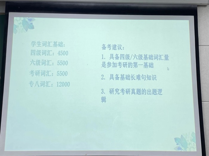 其次,针对学生词汇基础分析,孙老师提出,针对考研英语具体词汇量要求,教师应当采取科学方法分析学生现有词汇水平,定制个性化的词汇学习计划,如利用闪卡、软件或参加词汇挑战赛等,同时,定期进行词汇量测试,确保学生词汇量稳步提升。