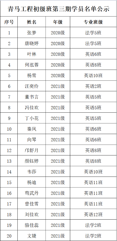 为进一步增强当代青年学子的政治意识,推进精神文明与物质文明相协调从而造就更好的自我,肩负起全面建设社会主义现代化国家的使命。为我院学生培养一批政治坚定、德才兼备、素质全面的学生干部和表现优秀突出的学生。经学院研究决定,开展人文学院青马工程初级班第三期培训,通过个人申请、笔试考核等,现将进入青马工程初级班第三期的学员名单进行公示如下: