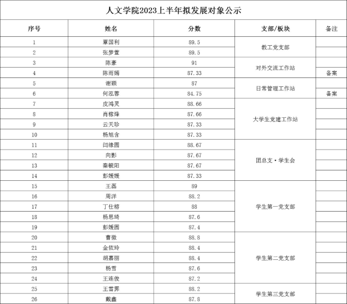 为了加强对发展党员工作的民主监督,保证发展党员质量,通过入党积极分子个人申请、支部推优、结合拟发展对象答辩等方式,人文学院党总支,学生一、二、三支部讨论研究决定,拟确定曹微等26位入党积极分子(包括备案同学)为拟发展对象。根据《中国共产党章程》及《中国共产党发展党员工作细则》有关规定,现将拟发展对象名单予以公示。
