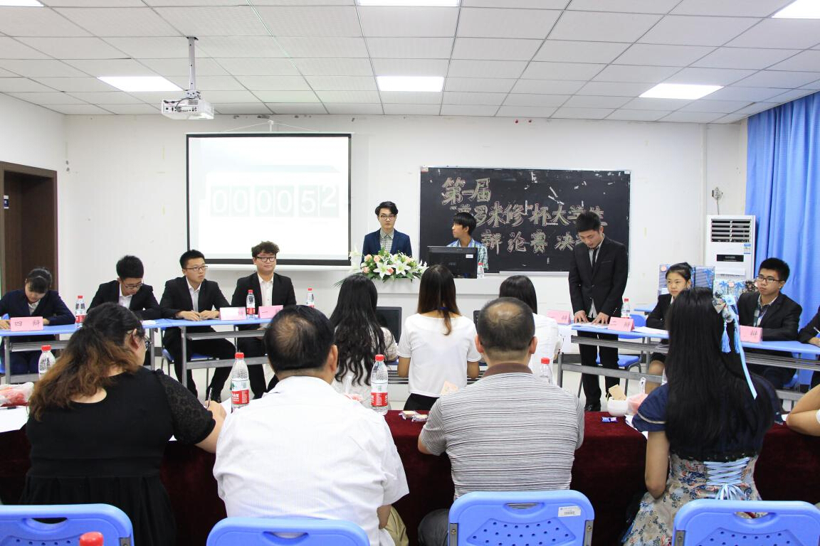2015年5月28日(周三)晚19点整,由校团委主办、人文学院学生会承办的第一届“普罗米修”杯大学生辩论赛决赛在第二行政楼101如期举行。比赛特邀学生处敖莹莹老师、胡迦老师、后勤处谭莉老师、陈星老师、校团委曾配源老师以及艺术设计学院王竞楠老师担任评委。出席本次比赛的嘉宾还有人文学院党总支副书记冯鑫以及法学教研室主任罗世荣教授。