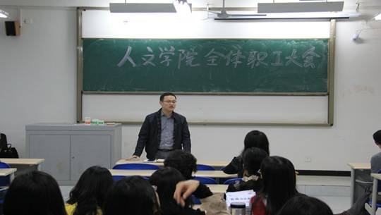 3月19日下午七点半,人文学院全体教工大会在新教108教室召开。出席此次会议的领导有人文学院院长邓仕伦、党总支副书记冯鑫。此外,各个教研室主任、副主任也参加了本次会议。会议主要传达了学院2013年工作要点的精神。
