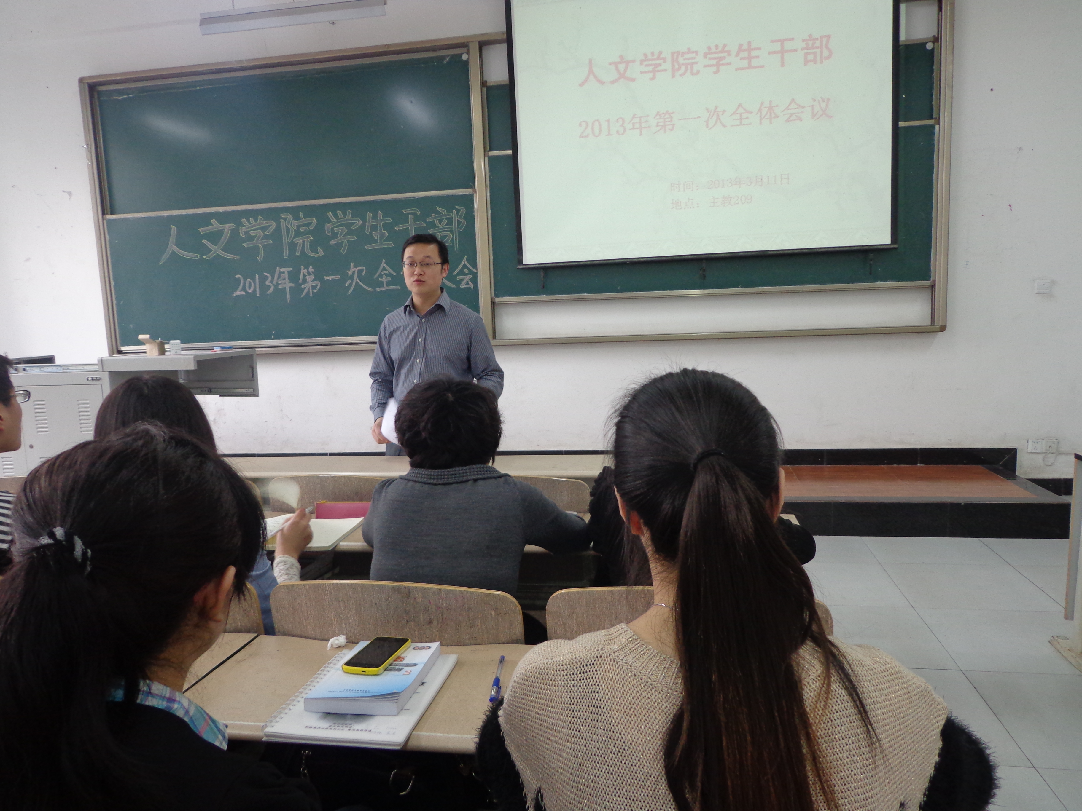 2013年3月11日下午,人文学院2013年第一次学生干部教育大会继续成功举行。学生干部教育大会是我院学生管理工作的惯例和特色,每学年均会举行多场“学生干部教育大会”,主要针对学生干部工作技巧、时事政治、突发事件处理等问题进行培训。本学期第一次教育大会由人文学院党总支书记冯鑫同志主持并作培训,人文学院全体辅导员、党员同志及团学干部参会。