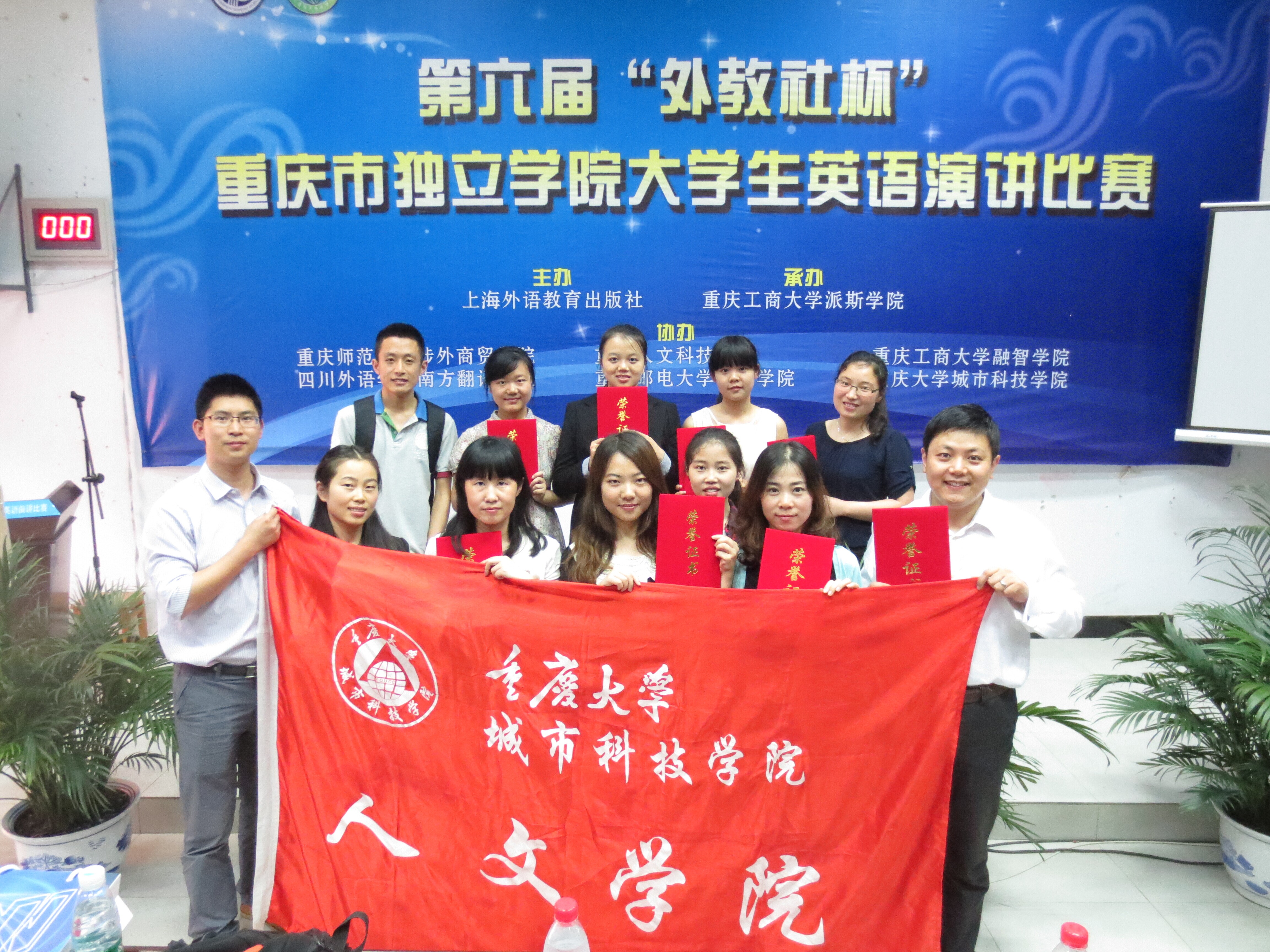 复赛于5月24日在重庆工商大学派斯学院举行,来自7所独立院校的共28名选手分别进行了以“Chinese Dream”为题的2分钟命题演讲,以及1分半的即兴演讲。经过激烈的角逐,我校4位参赛选手成功进入5月25日的决赛。进入决赛的选手每人进行3分钟的命题演讲,2分钟即兴演讲,以及与提问专家进行2分钟问答环节。我校4位同学在演讲中感情饱满,举止大方得体。在即兴演讲及回答问题环节中都能够有条理、逻辑清楚并不乏幽默感地对相应话题进行解答,得到了评委们及在场观众的一致认可。经过长达三个多小时的竞争,这4位同学脱颖而出,取得了优异的成绩。在总分排名前八位选手中,我校选手共占四席。最终,方肖同学荣获一等奖,李玥琪、吴采妮、陶丽伶同学均荣获二等奖。同时,我院指导老师袁莹荣获“指导老师一等奖,石永霞老师、常远老师、李淑晶老师也均荣获该大赛指导老师二等奖。