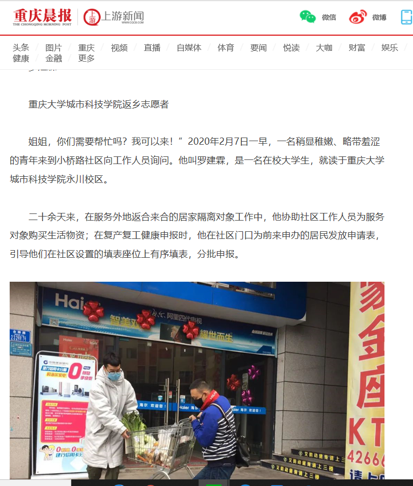 重庆晨报、上游新闻、品质钓办等多家媒体对罗建霖同学的请缨事迹进行报道,合川区钓鱼城街道评价说,面对疫情,罗建霖同学逆风而行,主动请缨,有效地助推了社区的疫情抗击工作,也充分展示了新时代志愿者的良好形象。
