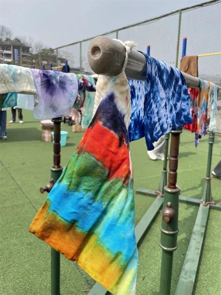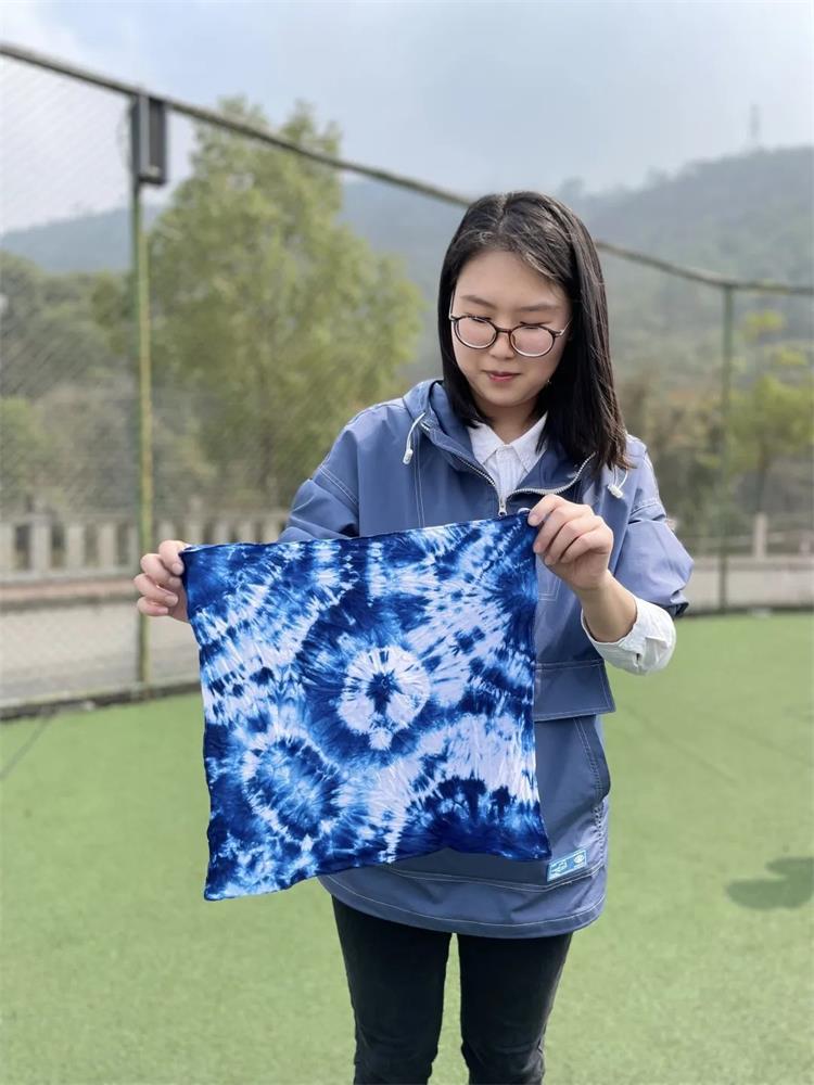 扎染古称扎缬、绞缬,古代常见的防染印花纺织品有绞缬、蜡缬和夹缬等种类。 是汉族民间传统而独特的染色工艺。织物在染色时部分结扎起来使之不能着色的一种染色方法,中国传统的手工染色技术之一。在南北朝时,扎染产品被广泛用于汉族妇女的衣着。在了解了扎染的起源意义之后,老师们通过纱、线、绳等工具,对织物进行扎、捆等,然后织物打绞成结后,再进行印染,之后把打绞成结的线拆除成为自己的作品。其色丰富,变化自然,以布传情,以花会友;用染布绘生活图景,以染料添生活气息,展现了当代女性热爱生活,正当芳华的精神风貌。染自己的布,种自己的花,赏自己的月,爱自己的世界,她们在自己的岗位恪尽职守,用实际活动书写人生华丽篇章。