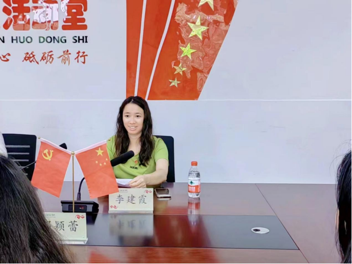 学生第三党支部书记李建霞领学《习近平在中共中央政治局第一次集体学习时强调,全面学习把握落实党的二十大精神奋力夺取全面建设社会主义现代化国家新胜利》,她提到贯彻落实党的二十大精神,全党必须全面学习,全面把握,全面落实,并以昂扬的精神状态,求真务实的工作作风投入到生活工作各方面。