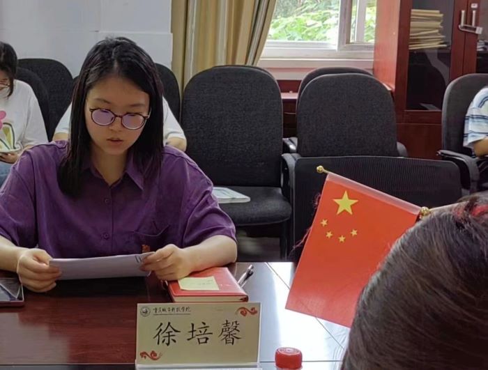 学生第二党支部宣传委员徐培馨领学《从党的二十大看以中国式现代化全面推进中华民族伟大复兴》,强调跑好“这一棒”阔步“向未来”,实现中国式现代化的宏伟蓝图,必须紧紧依靠人民,用行动兑现庄严承诺。