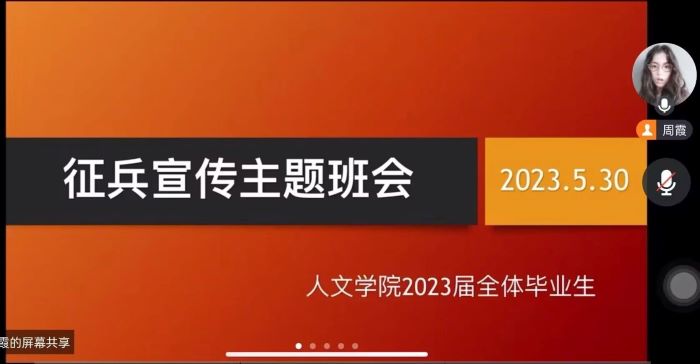 为扎实做好2023年大学生征兵宣传工作,扩大征兵宣传的影响力,激发大学生参军报国热情,营造爱国强军的大学文化氛围。人文学院2023届毕业班辅导员周霞老师,郎月婷老师,毛棋老师于5月30日晚上6:30开展了针对2023届毕业生的线上征兵宣传主题班会。