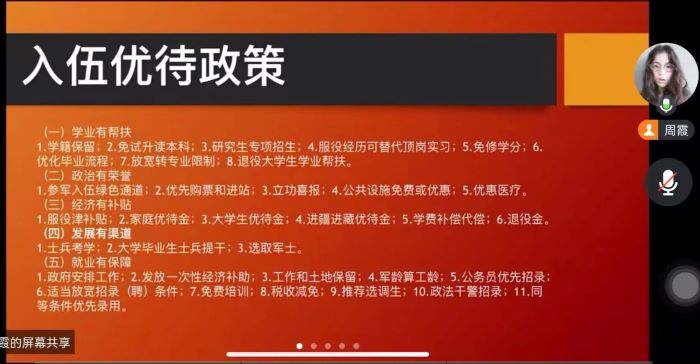 会议伊始,周霞从征兵时间、入伍基本条件、应征入伍程序等方面向同学们介绍了高校学生参军的各项规定和要求。随后,讲述了征兵意义及相关优惠政策,充分调动应征入伍积极性,强化服兵役的责任感和参军保家卫国的意识。