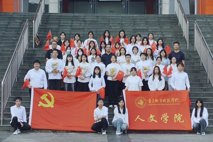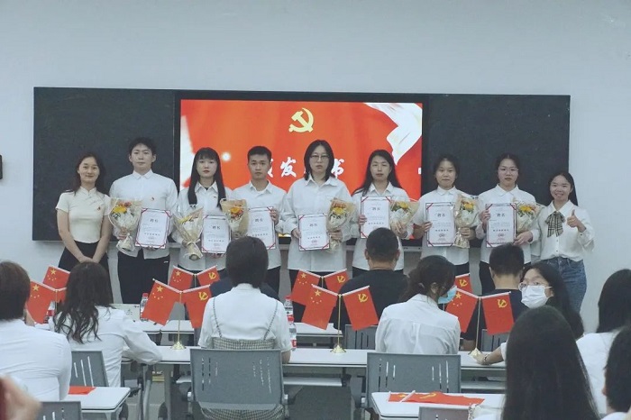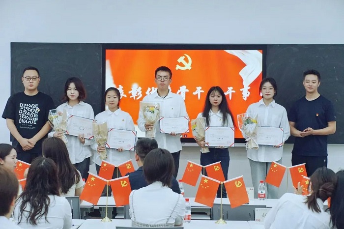 人文学院党总支组织委员田甜、党建工作站指导老师徐杰为第二届党建工作者颁发聘书,并合影留念。